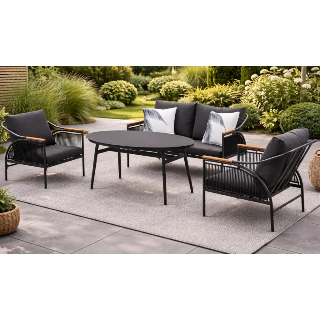 Lucca Set se vyznačuje elegantním výpletem na bocích, který dodává celé soupravě vzdušný a sofistikovaný vzhled. Ocelová konstrukce v antracitové barvě zajišťuje stabilitu a moderní styl, zatímco područky pohovky a křesel v přírodním odstínu dřeva vytvářejí příjemný kontrast.