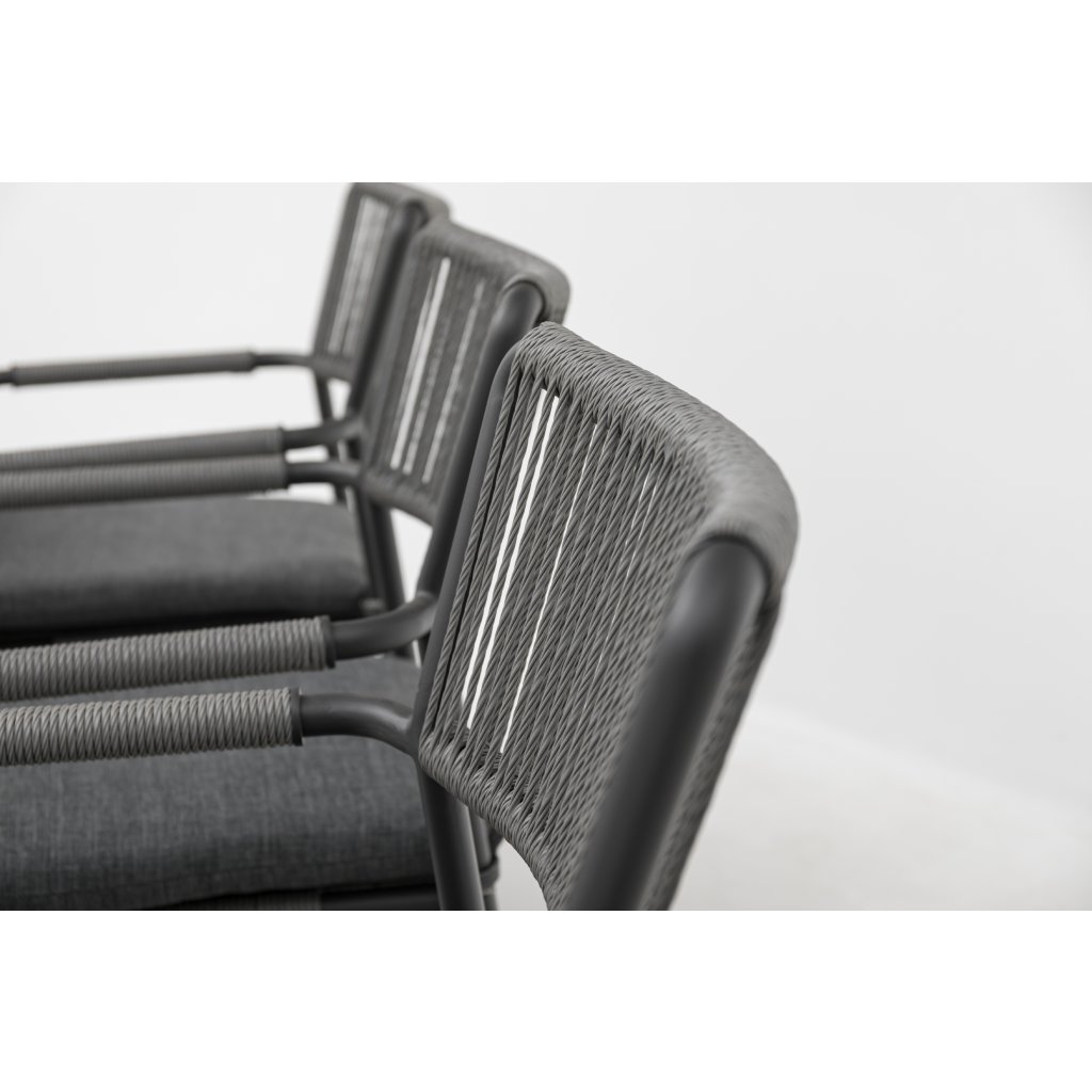 Praktická stohovací křesla s provazovým výpletem sedáku a opěrky, spolu s opletenými područkami, umožňují snadné uskladnění, když je zrovna nepotřebujete. Svou jednoduchou a čistou linií jsou nenáročné na manipulaci. Díky použitým materiálům jsou zcela bezúdržbové a odolné povětrnostním vlivům.