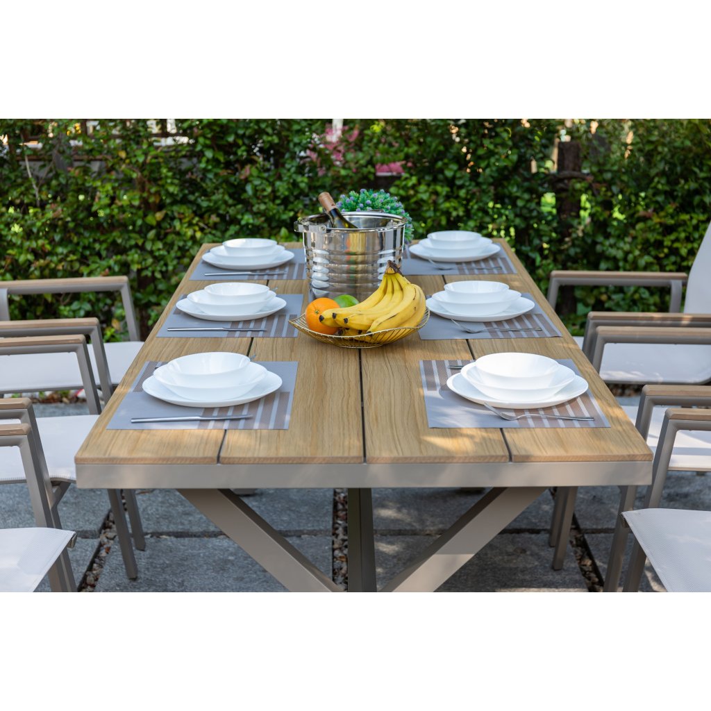 Stůl je vybaven deskou z materiálu, který imituje vzhled teakového dřeva, ale nejedná se o pravé dřevo. Tyto vlastnosti činí stůl nejen elegantní, ale také nenáročný na údržbu.