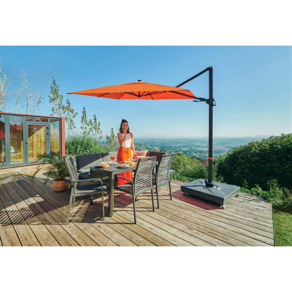 Díky obdélníkové střeše je slunečník zvláště vhodný pro zastínění zahradního nábytku. Slunečník lze také otáčet o 360 stupňů, osově natáčet na obě strany a naklápět dozadu v sedmi polohách. Světelné LED pásky jsou umístěny do 6 dlouhých ramen s dálkovým ovládáním. Během dne se baterie nabíjí ekologickým způsobem prostřednictvím solárního panelu na horní straně slunečníku.