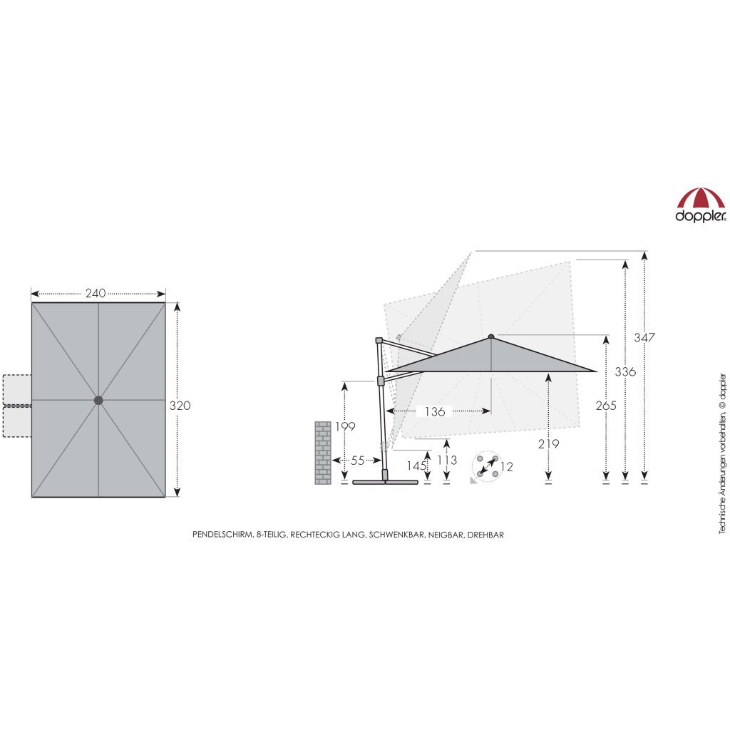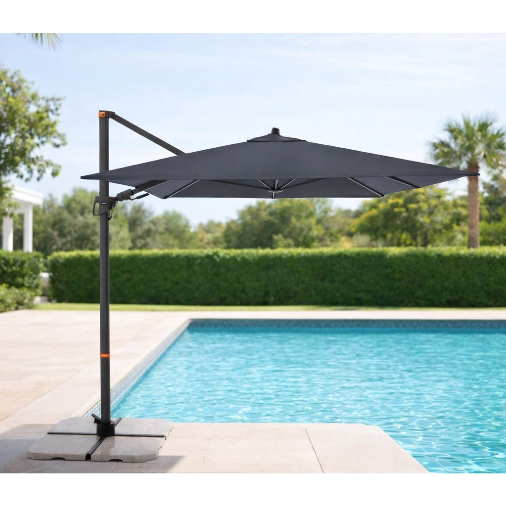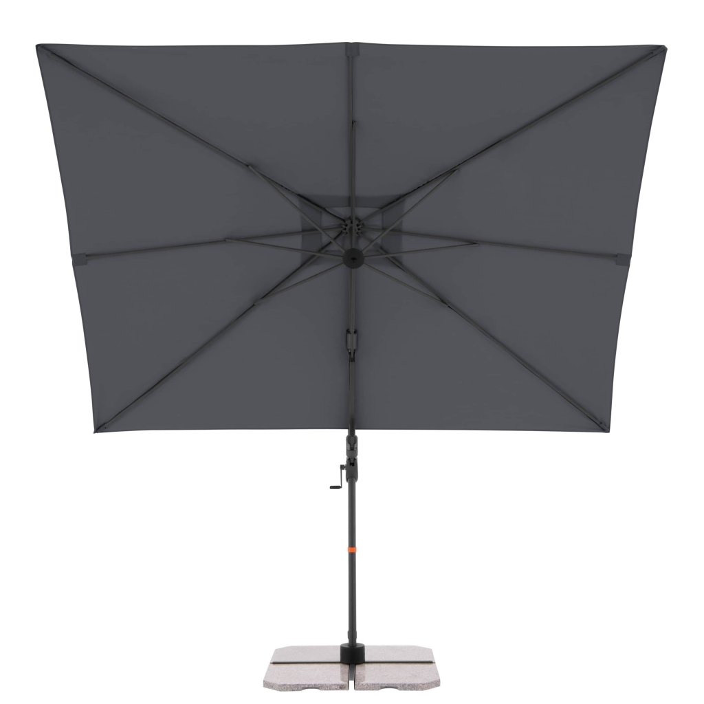Díky obdélníkové střeše je slunečník zvláště vhodný pro zastínění zahradního nábytku. Slunečník lze také otáčet o 360 stupňů, osově natáčet na obě strany a naklápět dozadu v sedmi polohách.