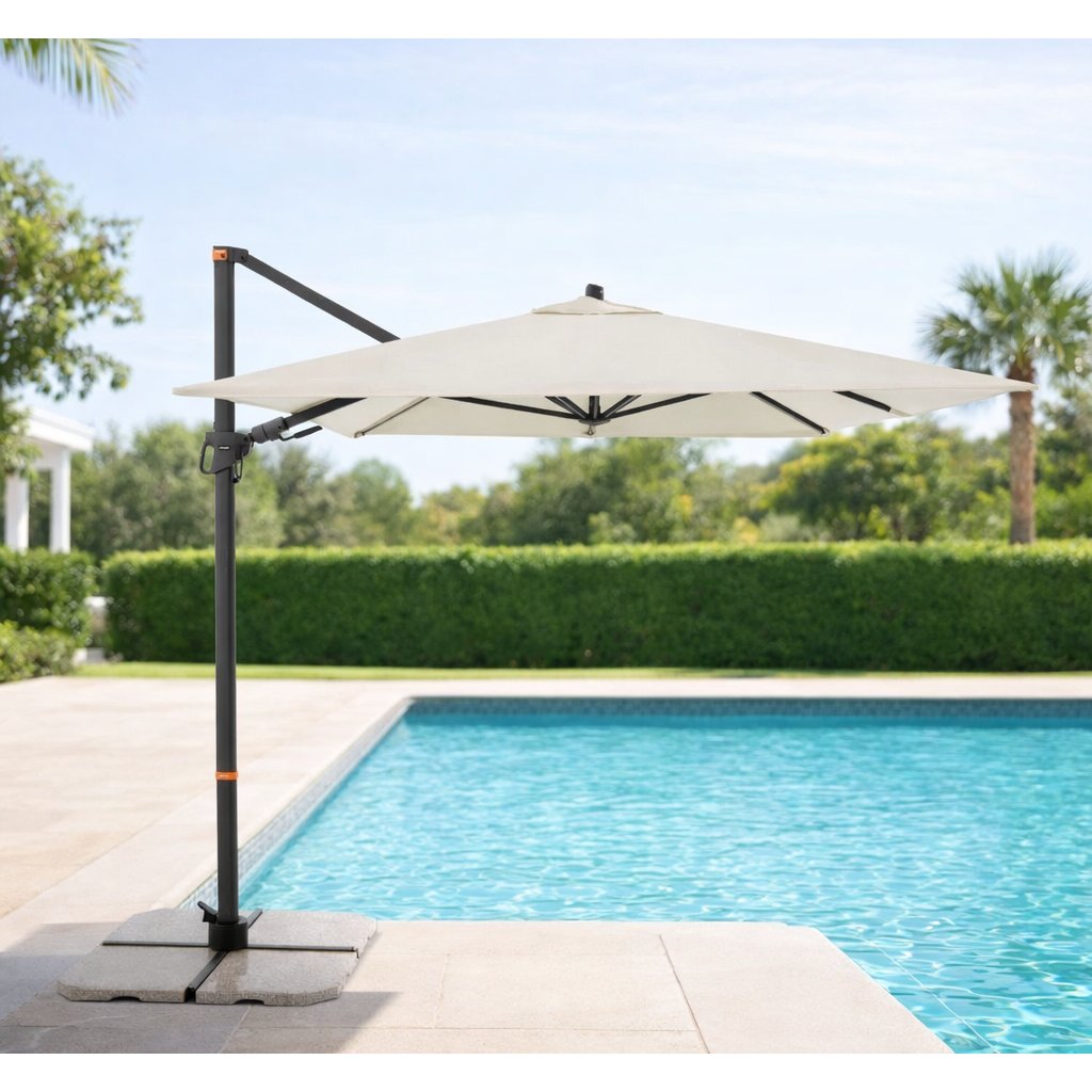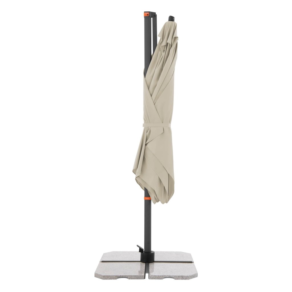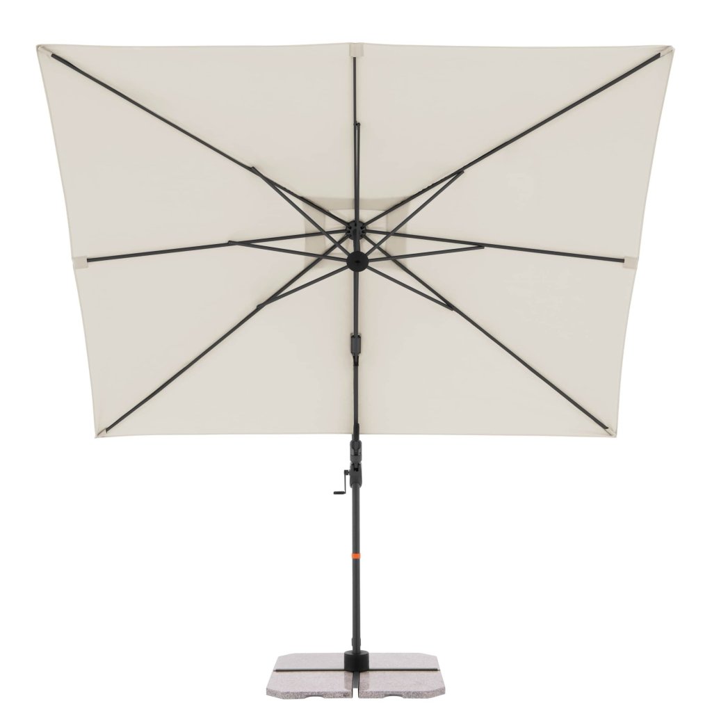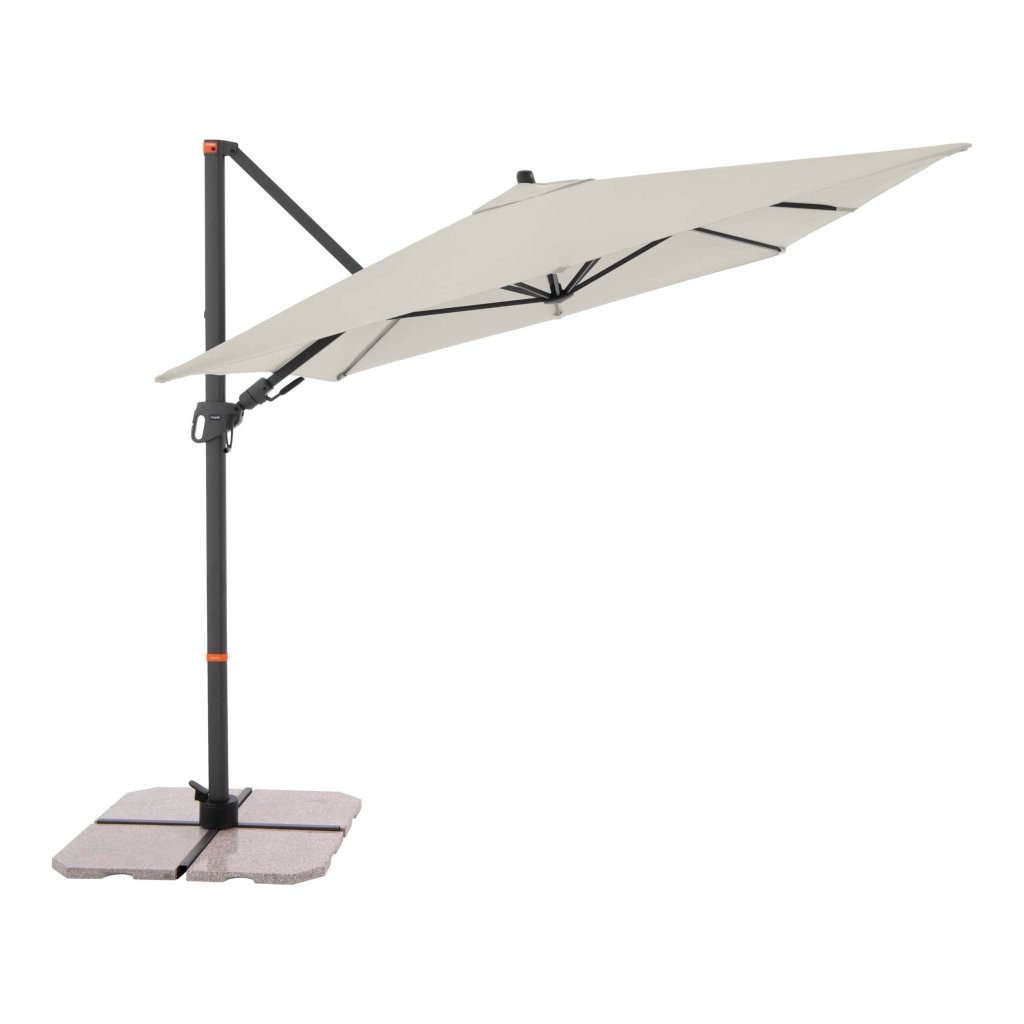 Díky obdélníkové střeše je slunečník zvláště vhodný pro zastínění zahradního nábytku. Slunečník lze také otáčet o 360 stupňů, osově natáčet na obě strany a naklápět dozadu v sedmi polohách.