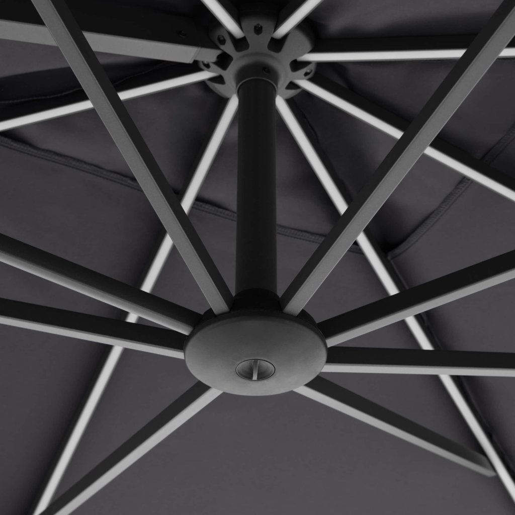 Díky obdélníkové střeše je slunečník zvláště vhodný pro zastínění zahradního nábytku. Slunečník lze také otáčet o 360 stupňů, osově natáčet na obě strany a naklápět dozadu v sedmi polohách. Světelné LED pásky jsou umístěny do 6 dlouhých ramen s dálkovým ovládáním. Během dne se baterie nabíjí ekologickým způsobem prostřednictvím solárního panelu na horní straně slunečníku.