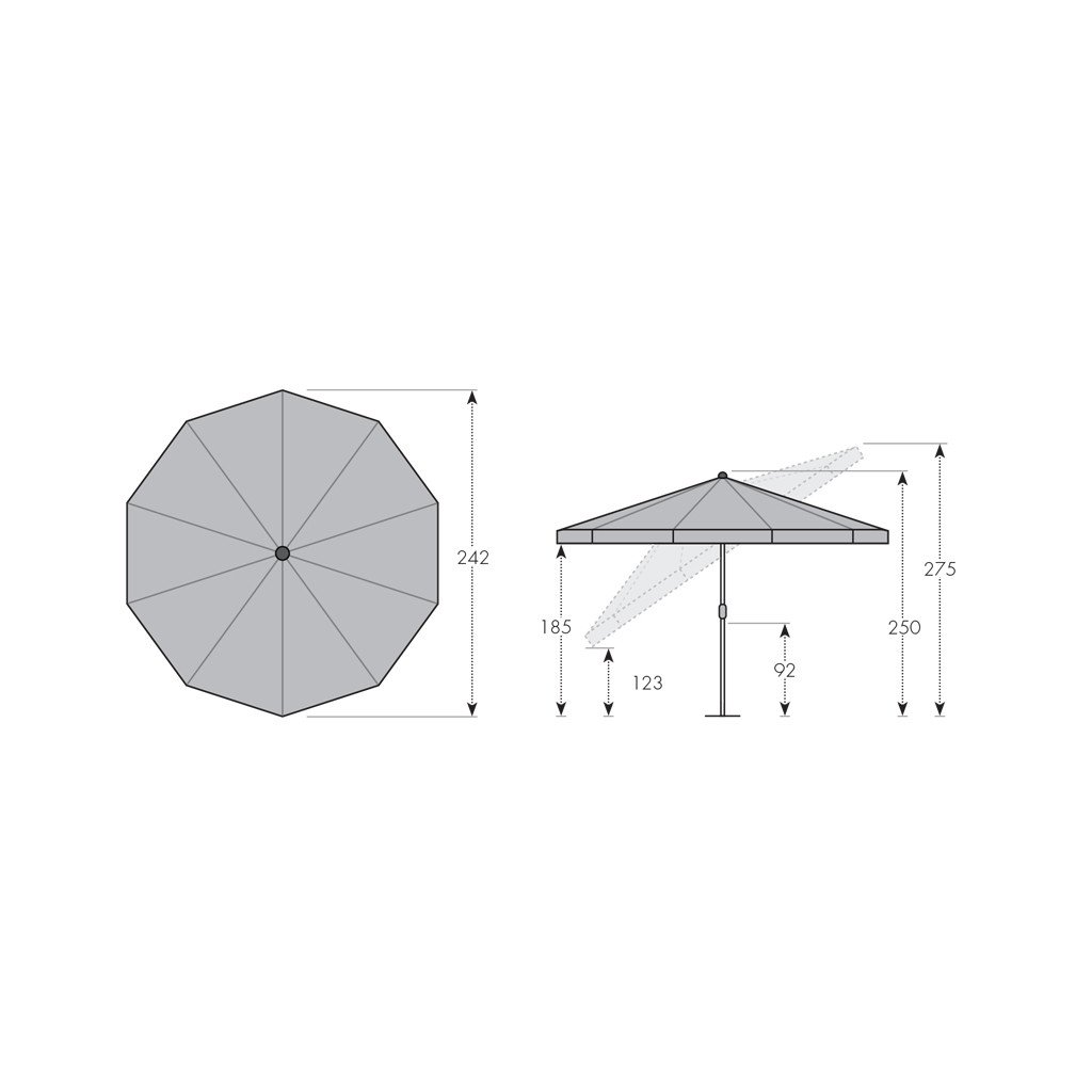 Tento slunečník je ideálním společníkem na balkón či terasu. Rám slunečníku je vyroben z oceli v antracitové barvě s epoxidovou povrchovou úpravou. Slunečník umožňuje komfortní naklopení střechy. Potah je vyroben z kvalitního nepromokavého polyesterového materiálu beze švů, který je odolný povětrnostním vlivům s dobrou UV ochranou 50+. Vhodný pro gastronomická zařízení.