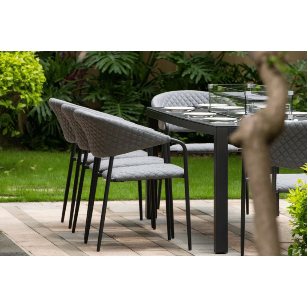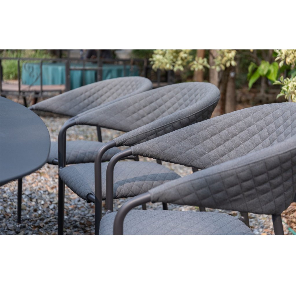 Šestice křesel Melia LIKA-TEX® dodává této sestavě nejen pohodlí, ale také moderní styl. Designová konstrukce z lehkého, ale stabilního hliníku v antracitové barvě je odolná vůči povětrnostním vlivům a snadno se přemisťuje. Komfortní polstrování s ozdobným prošíváním je vyrobeno z prémiové textilie LIKA-TEX®, která je odolná vůči vlhkosti, UV záření a rychle schne. Výplň z rychleschnoucí pěny zaručuje, že křesla lze nechávat venku po celý rok, aniž by utrpěla jejich kvalita.
