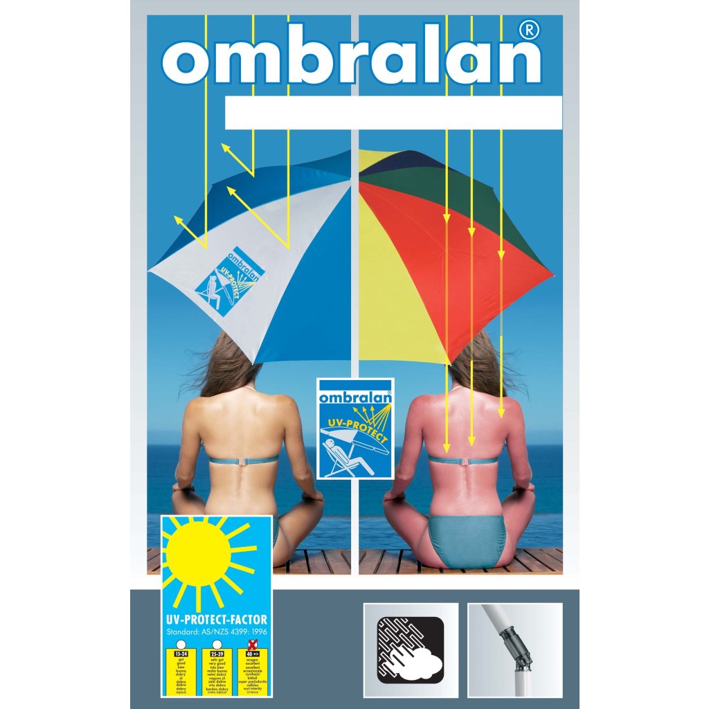 Ideální plážový slunečník – potah odolný povětrnostním vlivům je vhodný pro Vaši dovolenou u moře nebo návštěvu venkovního bazénu. Konstrukce je vyrobena z oceli s práškovým nástřikem, slunečník je možné naklopit pomocí kloubu. Potah je vyrobený z 100% polyesterové tkaniny s dobrou UV ochranou 50+.
