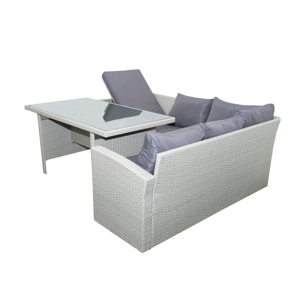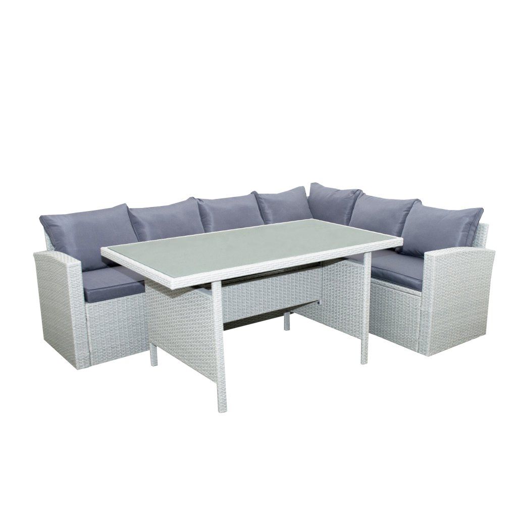 Elegantní souprava PANAMA je relaxační a zároveň jídelní zahradní rohová souprava se stabilní ocelovou konstrukcí, která je ošetřena povrchovou úpravou proti korozi a následně práškovým nástřikem. Konstrukce je opletena odolným umělým ratanem ve světle šedé barvě. Všechny použité materiály jsou bezúdržbové, odolné povětrnostním vlivům.