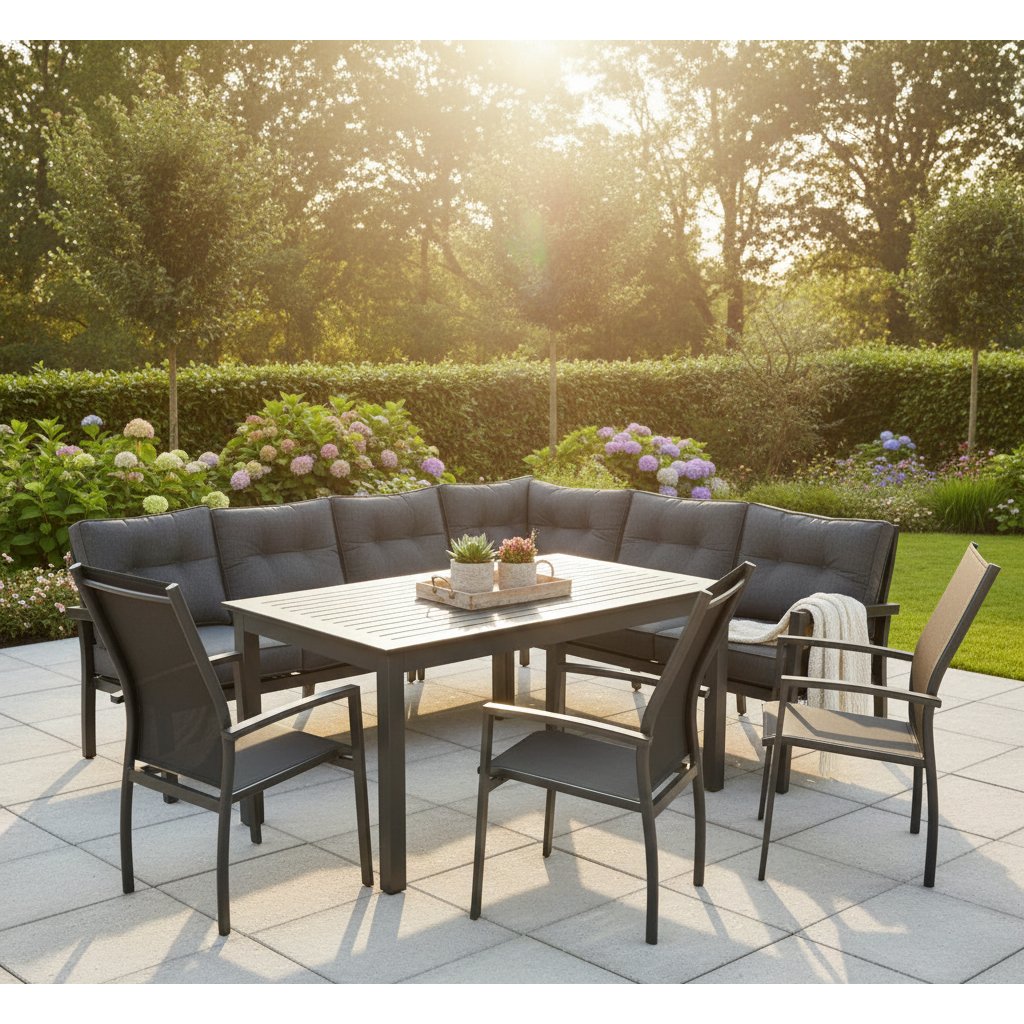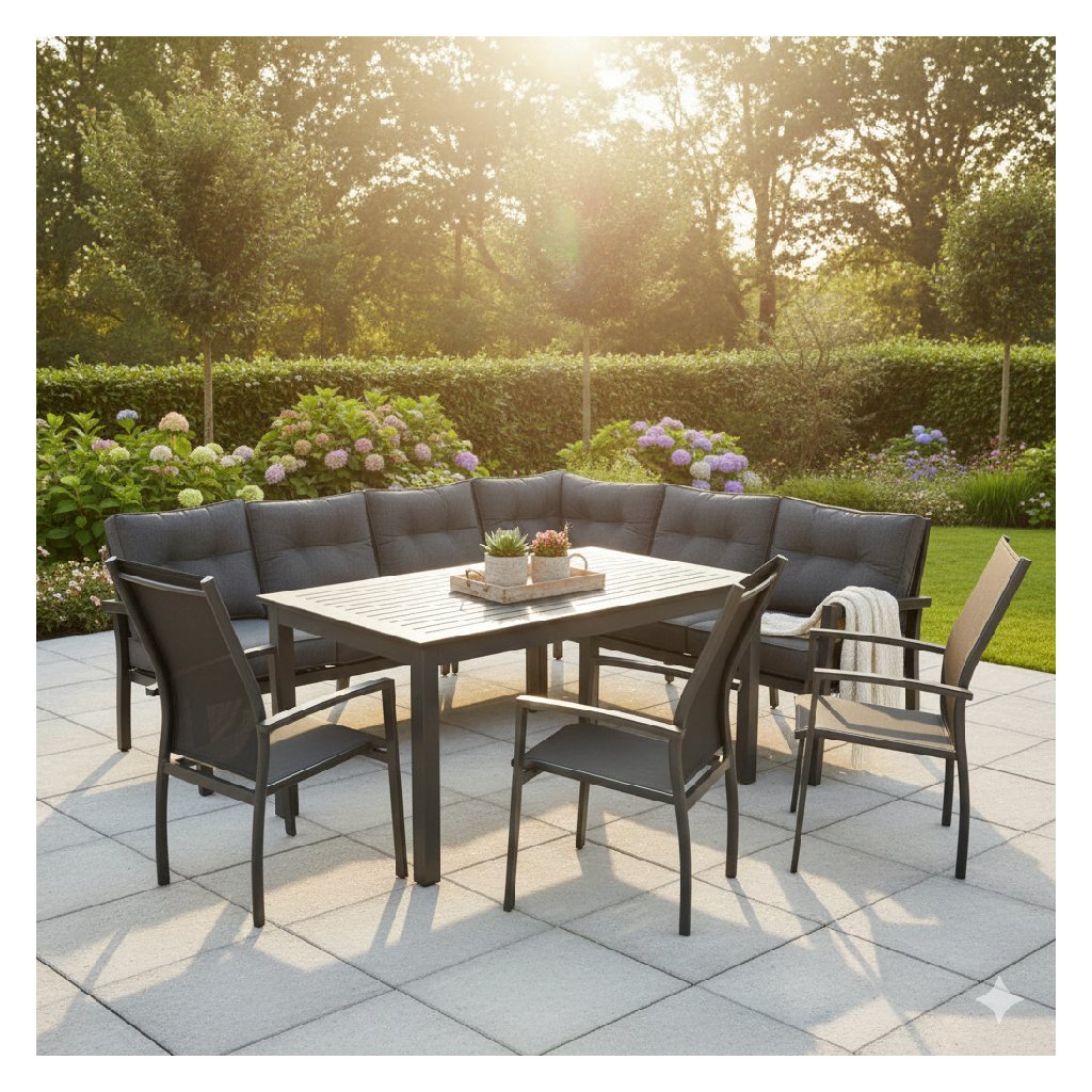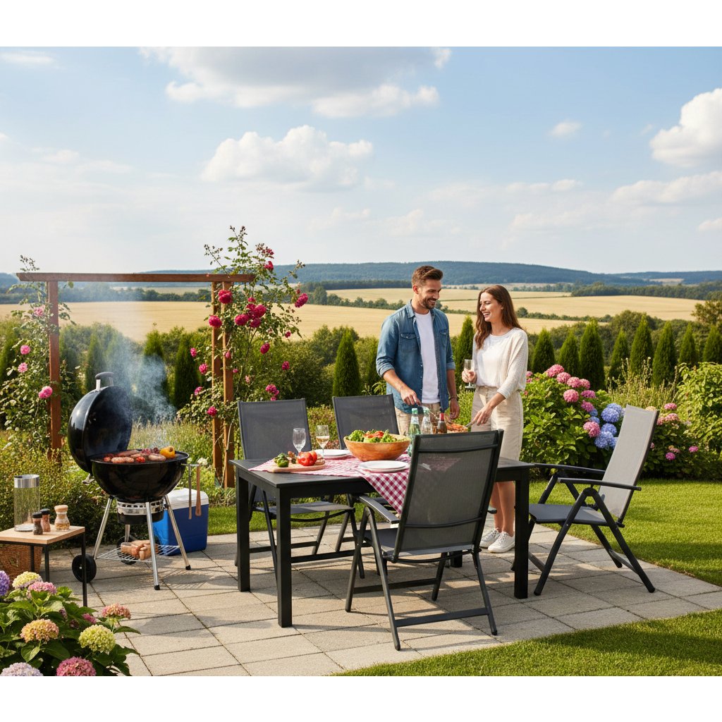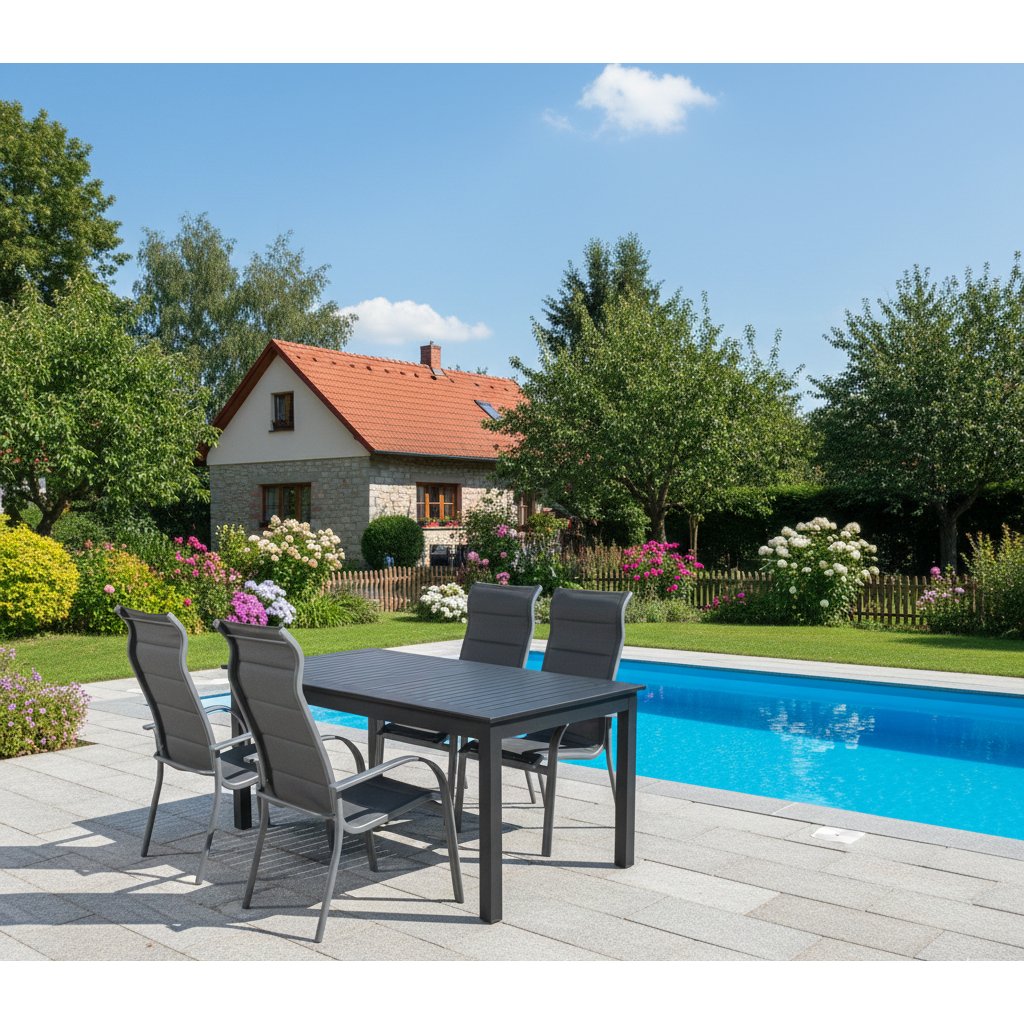 Součástí sestavy jsou čtyři zahradní stohovatelná křesla EXPERT značky DOPPLER, která se vyznačují pevnou, ale lehkou hliníkovou konstrukcí v antracitové barvě a ergonomicky tvarovaným sedákem s výpletem z odolné umělé textilie v černé barvě. Křesla jsou navržena tak, aby poskytovala vysoký komfort při sezení, a díky možnosti stohování také šetří místo při uskladnění.