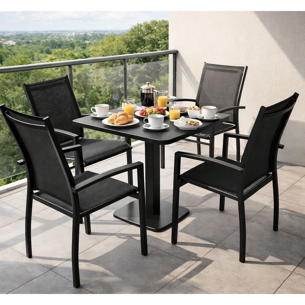 Součástí sestavy jsou čtyři zahradní stohovatelná křesla EXPERT značky DOPPLER, která se vyznačují pevnou, ale lehkou hliníkovou konstrukcí v antracitové barvě a ergonomicky tvarovaným sedákem s výpletem z odolné umělé textilie v černé barvě. Křesla jsou navržena tak, aby poskytovala vysoký komfort při sezení, a díky možnosti stohování také šetří místo při uskladnění.