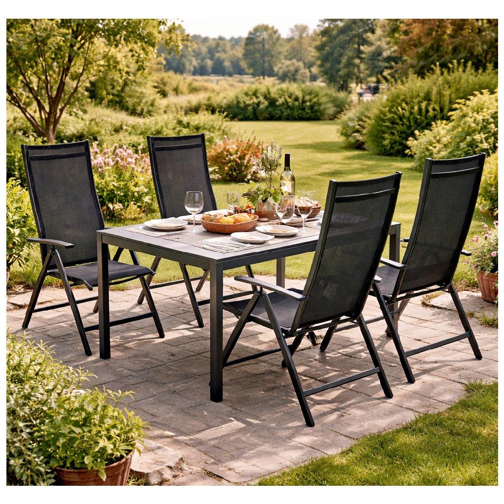 Dominantou sestavy je zahradní stůl PICASO s pevnou hliníkovou konstrukcí v antracitové barvě a deskou z kvalitního HPL materiálu v přírodním dekoru. HPL je vícevrstvý laminát, který je mimořádně odolný vůči poškrábání, opotřebení, vlhkosti i teplotním výkyvům. Deska je bezspárová, barevně stálá a snadno se udržuje. Stůl se díky svému rozměru 160 × 90 cm hodí i pro větší počet osob a díky elegantnímu a nadčasovému vzhledu skvěle zapadne do každého moderního venkovního prostoru.