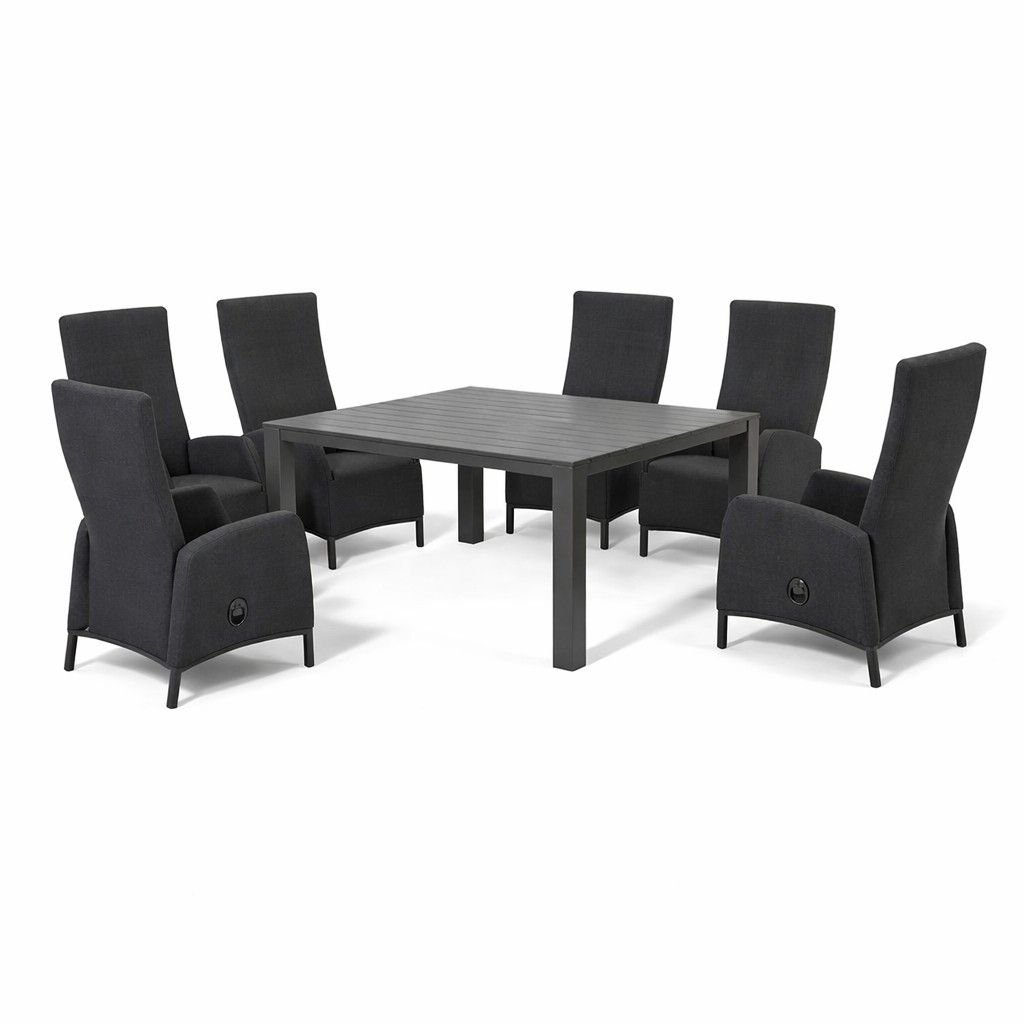 Tato luxusní souprava je vhodná pro každého, kdo hledá elegantní nábytek s mimořádnou odolností vůči nepřízni počasí. Sestava se skládá ze 6 polohovacích křesel a velkého hliníkového čtvercového stolu.