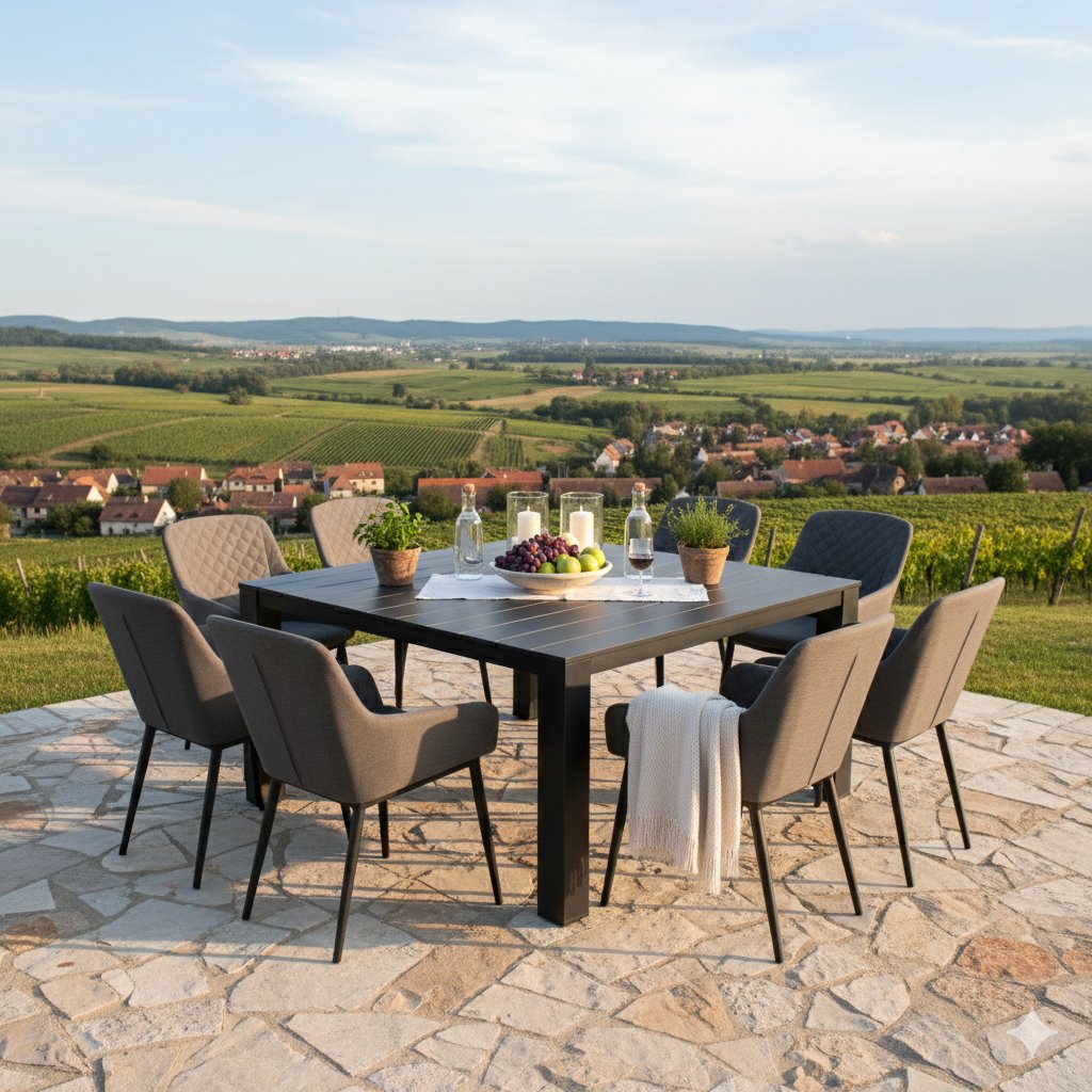 Tato luxusní souprava je vhodná pro každého, kdo hledá elegantní nábytek s mimořádnou odolností vůči nepřízni počasí. Sestava se skládá z 8 polstrovaných křesel a velkého hliníkového čtvercového stolu.