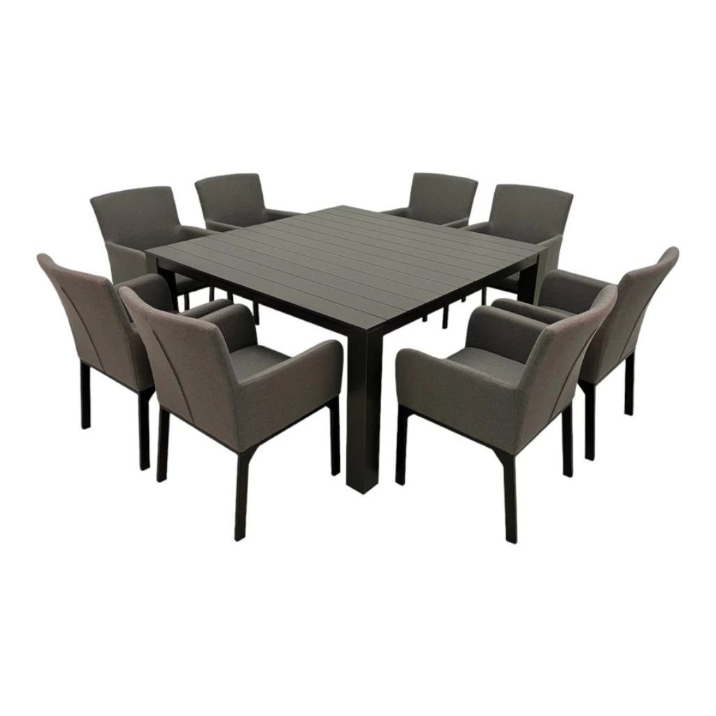 Tato luxusní souprava je vhodná pro každého, kdo hledá elegantní nábytek s mimořádnou odolností vůči nepřízni počasí. Sestava se skládá z 8 polstrovaných křesel a velkého hliníkového čtvercového stolu.
