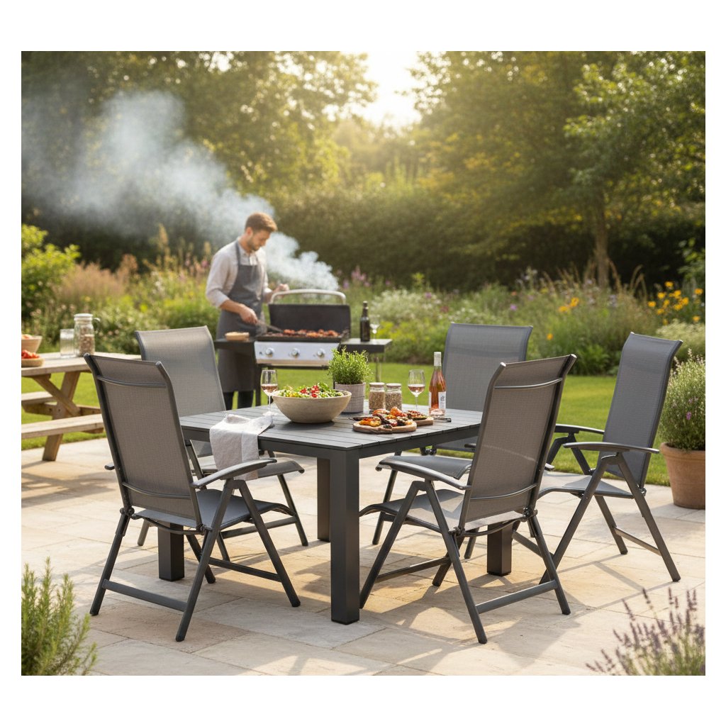 Křesla mají lehkou antracitovou hliníkovou konstrukci a výplet z kvalitní umělé textilie v žíhaně šedé barvě. 10stupňový polohovací systém opěrky zaručí maximální pohodlí při odpočinku. Vše doplňují hliníkové područky a široký tvarovaný sedák i opěrka, čímž je docíleno maximálního pohodlí. Křeslo lze snadno rozkládat i skládat a ušetřit tak místo potřebné na skladování.