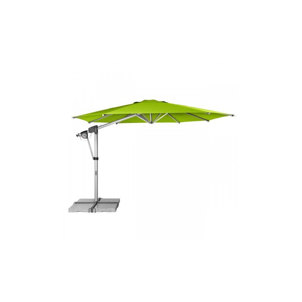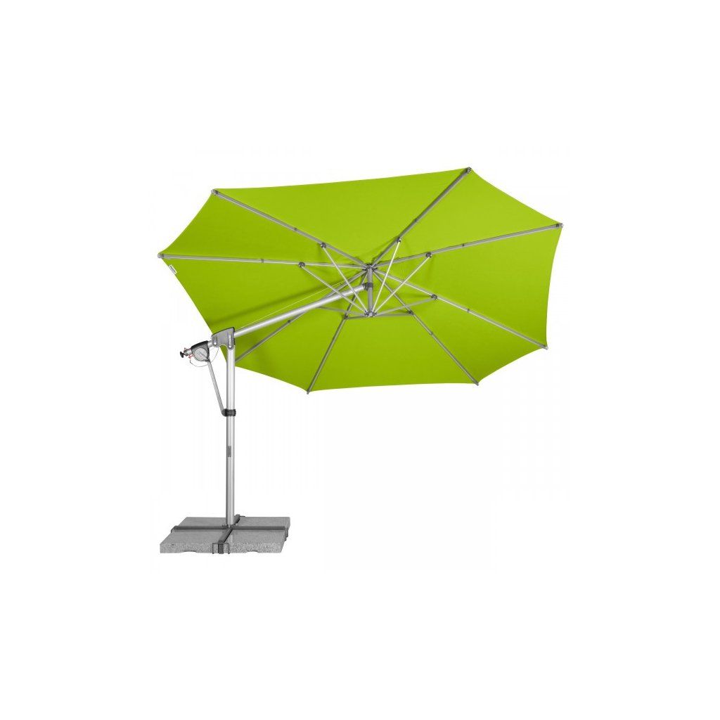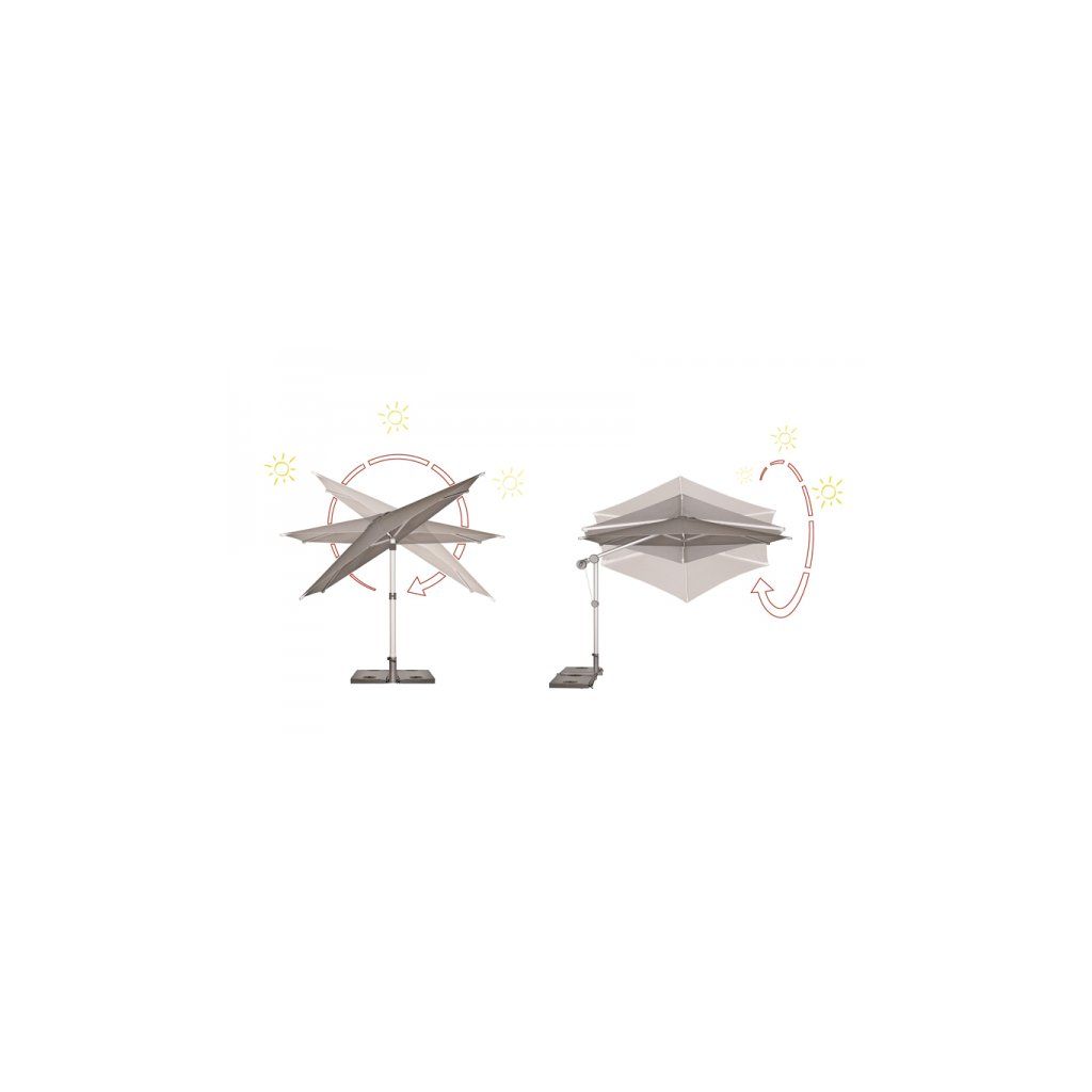 Vysoce kvalitní slunečník otočný o 360° ""ideální"" pro přizpůsobení se téměř každé poloze slunce.Celý rám je vyroben z vysoce kvalitního hliníku obohaceného o prvky hořčíku a křemíku. Použitím patentovaného mechanismu je možné naklápět střechu slunečníku v obou směrech. Potah slunečníku je tkaný ve dvou barvách a má vysokou stálobarevnost a vysokou UV ochranu 80. Potah slunečníku je snímatelný a je možné ho čistit ručním praním. Všechny pohyblivé části jsou šroubovány a jsou proto snadno vyměnitelné. Součástí balení je i ochranný obal se zipem a tyčkou pro snazší manipulaci. Záruka na potah 5 let proti vyblednutí (při použití pro soukromé účely).