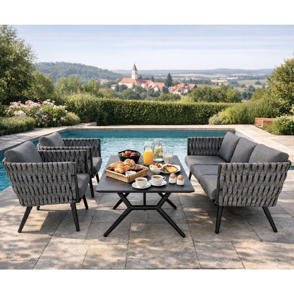 Pevná hliníková konstrukce s moderním práškovým nástřikem v antracitové barvě dodává sestavě nejen robustnost, ale i nadčasový vzhled, který se hodí do každého exteriéru i interiéru. Provazový výplet na opěrkách a područkách zajišťuje atraktivní design a pohodlí, které oceníte při každém posezení.