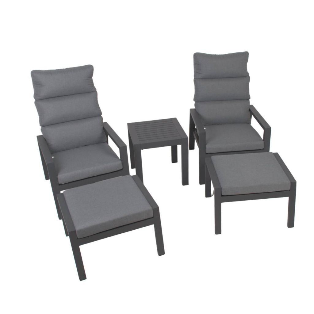 Zahradní relaxační sestava SANTINI je multifunkčním řešení pro každého, kdo rád relaxuje na zahradě či terase. Obě křesla mají možností polohování opěrek zad pomocí pístu. Součástí sestavy jsou také taburety a stolek, v mžiku si tak vytvoříte pohodlný relax. Nadýchané polstry mají antracitové potahy ze 100% polyesteru, který je odolný v tahu, dobře odolává oděru či vlivům slunečního záření. Polstry jsou na zipy, potah je možné sejmout a vyprat. Samozřejmostí je bezúdržbová a stabilní hliníková konstrukce opatřená ochranným práškovým nástřikem v antracitové barvě, jejíž lehkost jistě oceníte vždy, když budete chtít sestavu přemístit.