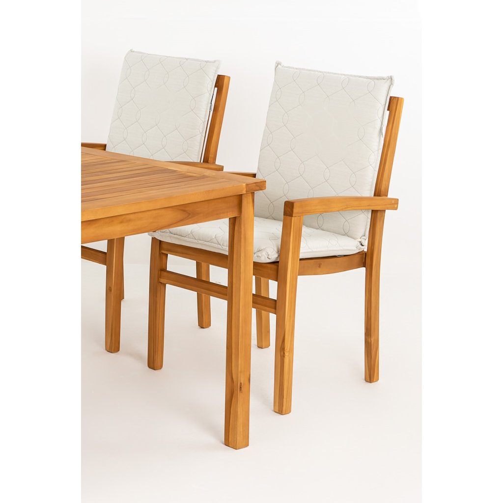 Stohovací křeslo Taman je vyrobeno z kvalitního vysušeného teakového dřeva, které je mimořádně odolné, vysoce trvanlivé a pevné. Laťový sedák, pevné područky i opěrka křesla jsou navrženy tak, aby křeslo bylo co nejpohodlnější a aby co nejlépe podepíralo jednotlivé části těla. Křeslo je masivní, přesto skladné, díky stohovacímu systému. Spoje a kování jsou z nerezavějícího materiálu.