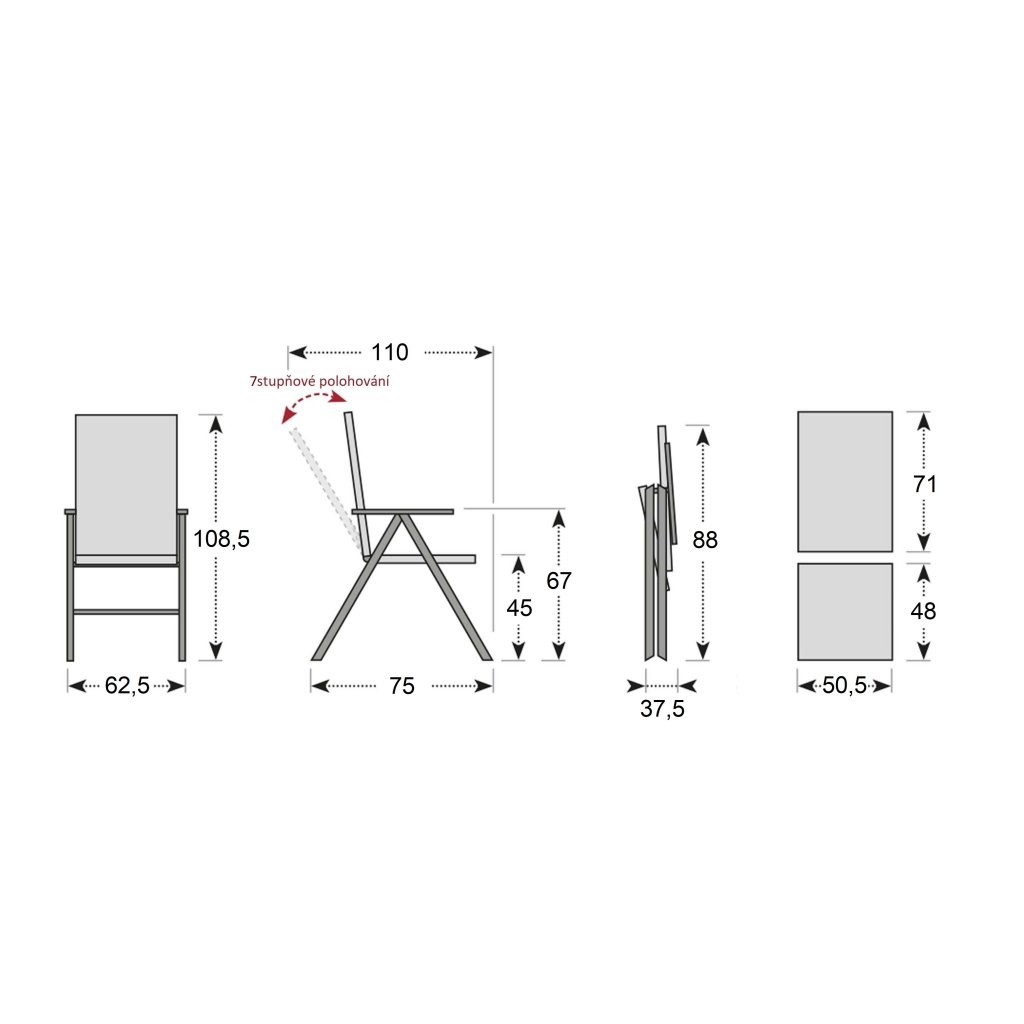 | Vlastnosti a funkce: | Nábytek odolný povětrnostním vlivům, Polohovatelné, rozložitelná židle, křeslo, Rozkládací stůl |