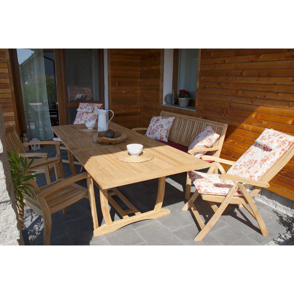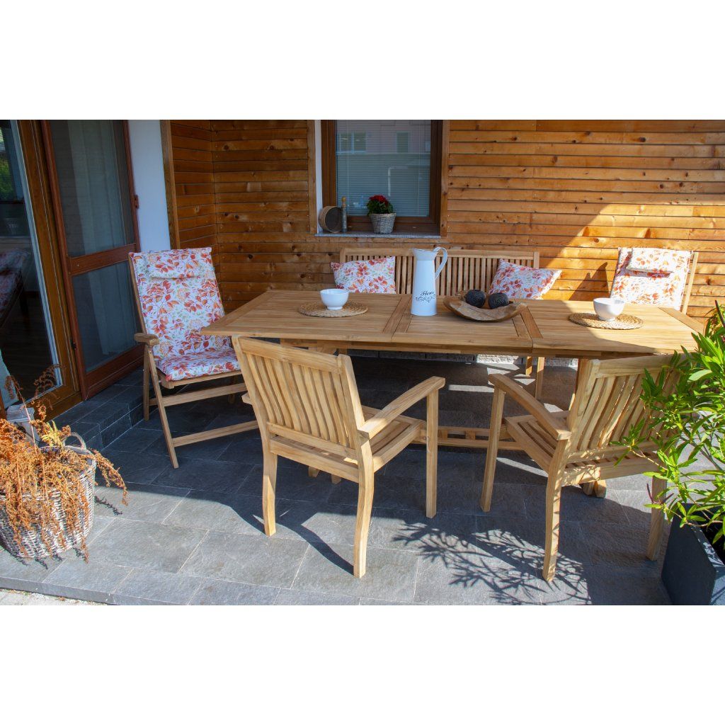 Luxusní masivní rozkládací stůl tectona značky doppler je vyroben z exotického, velice trvanlivého a tvrdého teakového dřeva. Kvalitní vysušené teakové dřevo dokáže odolat extrémním podmínkám jakými jsou vlhkost, velké výkyvy teplot, přímé sluneční záření nebo naopak mráz. Navíc nelze opomenout jeho jedinečný luxusní vzhled. Nejcennější vlastností teakového dřeva je jeho vysoká trvanlivost a odolnost vůči vlivům počasí či hmyzu a plísním. Díky své husté struktuře masivního dřeva je teakové dřevo maximálně stabilní. Teakové dřevo díky své odolnosti vůči povětrnostním vlivům se používá především k výrobě zahradního nábytku. Luxusní zahradní nábytek pak může od jara do podzimu zůstat venku, aniž by mu vliv počasí uškodil. Povrchově teak lze upravit přírodním olejem nebo mořením. Po čase materiál ztmavne a tím získá svou typickou a nezaměnitelnou patinu. Po ošetření teakovým olejem si nábytek zachovává původní vzhled dřeva a barvu nemění. Celodřevěný rozkládací stůl tectona má pevnou dřevěnou konstrukci a rozkládací desku z přírodního, kvalitního teakového dřeva. Stůl je možné rozložit díky jednoduchému systému zabudované desky. To zaručuje nejen vysokou míru funkčnosti, ale i snadnou manipulaci a velmi jednoduchou údržbu. Sklopná konstrukce s rychlouzamykatelným zámkem zajišťuje rychlé a pevné skládání a rozkládání stolu bez omezení jeho stability. Skládací zahradní teakový stůl je všestranný, stylový kus nábytku, který se hodí svou variabilitou k menším rodinným setkáním a zároveň v rozloženém stavu bude nepostradatelným pomocníkem i při větších oslavách. Rostoucí zálibou čistého a jednoduchého designu, se stal zahradní nábytek z teakového dřeva velice žádaným designovým nábytkem a jistě oceníte nejen skvělé vlastnosti rozkládacího stolu tectona, ale také krásu přírodního materiálu ze kterého je tento zahradní stůl vyroben. Stůl: šxdxv: 100cm x 180/240cm x 75 cm. Balení: šxdxv: 102cm x 182cm x 14 cm.Luxusní masivní rozkládací stůl TECTONA značky DOPPLER je vyroben z exotického, velice trvanlivého a tvrdého teakového dřeva. Kvalitní vysušené teakové dřevo dokáže odolat extrémním podmínkám jakými jsou vlhkost, velké výkyvy teplot, přímé sluneční záření nebo naopak mráz. Navíc nelze opomenout jeho jedinečný luxusní vzhled. Nejcennější vlastností teakového dřeva je jeho vysoká trvanlivost a odolnost vůči vlivům počasí či hmyzu a plísním. Díky své husté struktuře masivního dřeva je teakové dřevo maximálně stabilní.