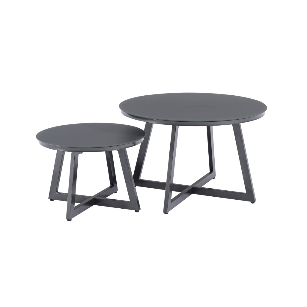 - 2× zahradní stolek Tiso: hliníková konstrukce, skleněná deska, rozměry: ⌀ 50 × 35 cm a ⌀ 70 × 45 cm