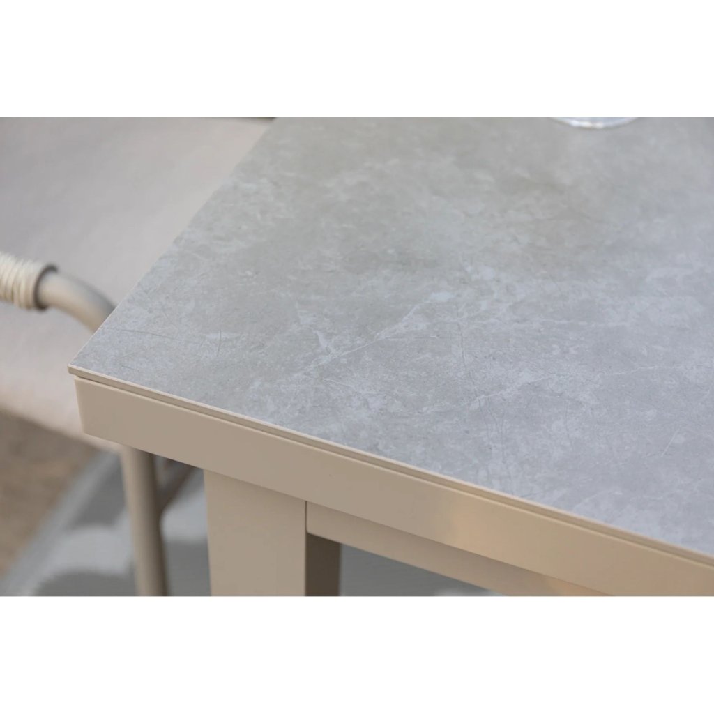Zahradní rozkládací stůl VELIA s deskou ze spékaného kamene nejenže vypadá jako keramika, ale je pevnější a odolnější vůči skvrnám, poškrábání a změnám barvy, přičemž je tepelně i mrazuvzdorně odolný a snadno se udržuje. Navíc je stůl velmi snadný na údržbu. Tento stůl je nejen praktický, ale také šetrný k životnímu prostředí, což ho činí ideální volbou pro každého, kdo hledá udržitelné a kvalitní řešení pro svůj venkovní prostor.